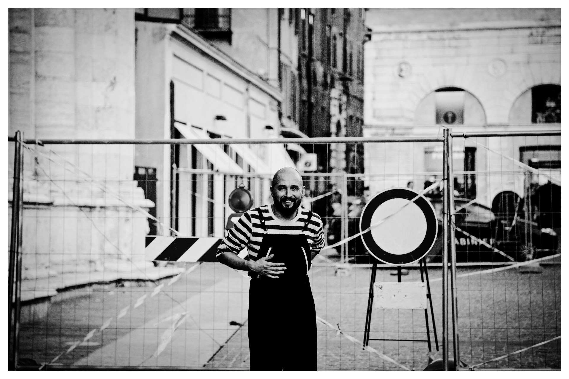 su espectáculo es mas bien poético y su comicidad innata le permite jugar con diversas técnicas de circo y teatro.